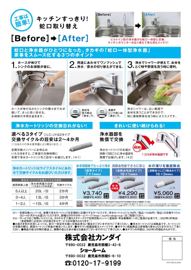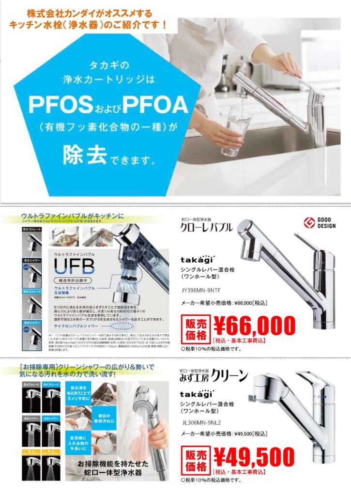 浄水器付きの台所用混合水栓の取り扱いをスタートしました! タカギさんの蛇口は全商品お取り扱いしております。チラシに掲載している商品は在庫もございますので、すぐに取り付けが可能です。 「気になるな」「交換したいな」という方は、ぜひお気軽にお問い合わせください! お知らせ