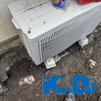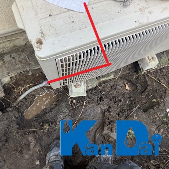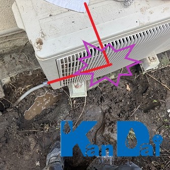 室外機の下に潜っている塩ビ管のエルボが割れています